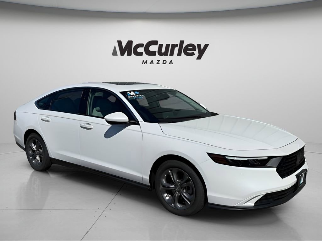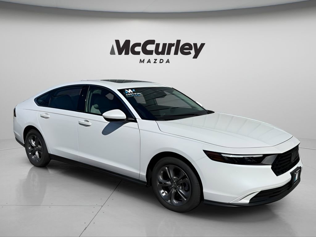 2024 Honda Accord EX FWD CVT 1.5T I4 DOHC 16V Turbocharged VTEC Platinum McCurley Certified + Certified, Black w/Fabric Seat Trim, 4-Wheel Disc Brakes, 8 Speakers, ABS brakes, Adaptive Cruise Control: Adaptive Cruise Control (ACC) with Low-Speed Follow, Air Conditioning, Alloy wheels, AM/FM radio, Apple CarPlay/Android Auto, Auto High-beam Headlights, Auto-dimming Rear-View mirror, Automatic temperature control, Blind Spot Information (BSI) System warning, Brake assist, Bumpers: body-color, Compass, Delay-off headlights, Driver door bin, Driver vanity mirror, Dual front impact airbags, Dual front side impact airbags, Electronic Stability Control, Emergency communication system: HondaLink Assist, Exterior Parking Camera Rear, Fabric Seat Trim, Four wheel independent suspension, Front anti-roll bar, Front Bucket Seats, Front Center Armrest, Front dual zone A/C, Front reading lights, Fully automatic headlights, Heated Front Bucket Seats, Heated front seats, Illuminated entry, Knee airbag, Lane departure: Lane Keeping Assist System (LKAS) active, Low tire pressure warning, Occupant sensing airbag, Outside temperature display, Overhead airbag, Overhead console, Panic alarm, Passenger door bin, Passenger vanity mirror, Power door mirrors, Power driver seat, Power moonroof, Power steering, Power windows, Radio data system, Radio: 180-Watt AM/FM Audio System, Rear anti-roll bar, Rear reading lights, Rear seat center armrest, Rear side impact airbag, Rear window defroster, Remote keyless entry, Security system, Speed control, Speed-sensing steering, Speed-Sensitive Wipers, Split folding rear seat, Steering wheel mounted audio controls, Tachometer, Telescoping steering wheel, Tilt steering wheel, Traction control, Trip computer, Variably intermittent wipers, Wheels: 17 x 7.5 Pewter Gray, Black w/Fabric Seat Trim.