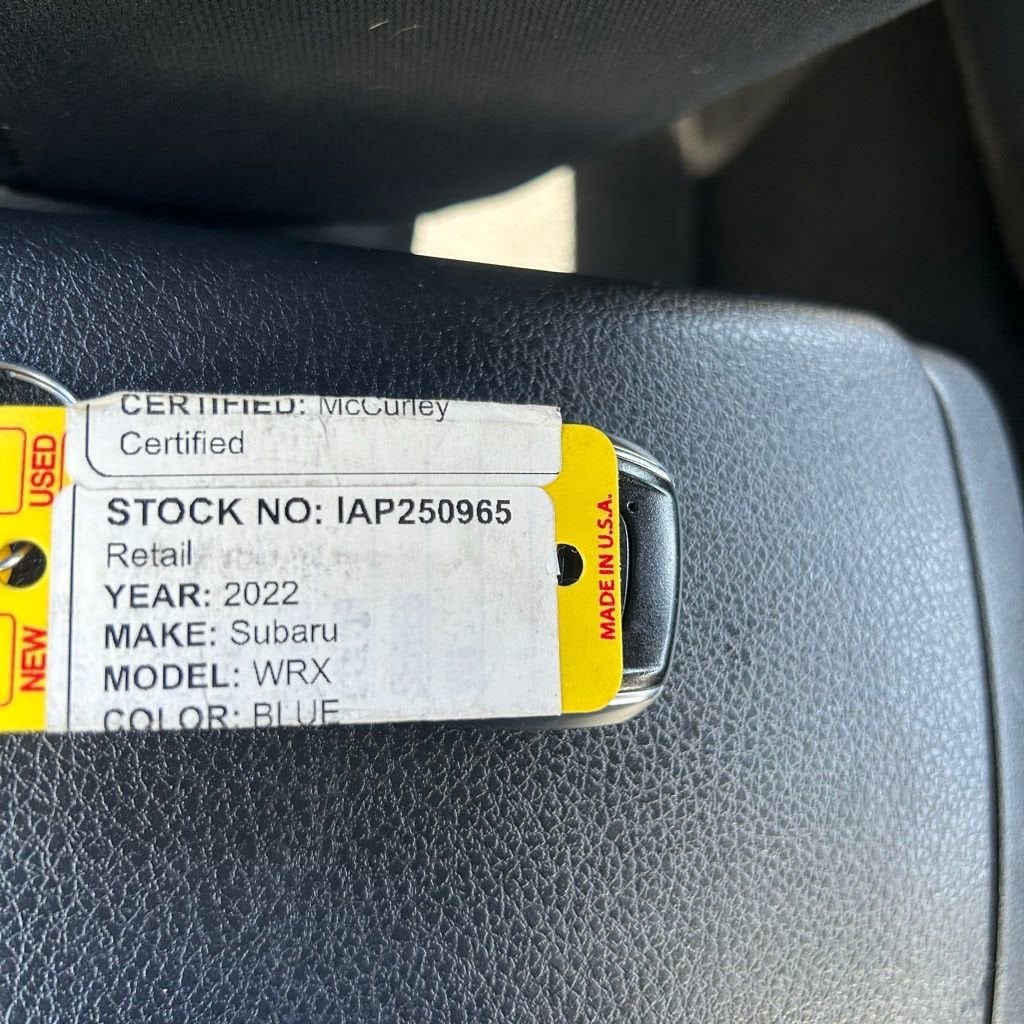 2022 Subaru WRX Premium AWD 6-Speed Manual 2.4L DOHC WR Blue Pearl McCurley Certified Certified, 4-Wheel Disc Brakes, 6 Speakers, ABS brakes, Air Conditioning, Alloy wheels, AM/FM radio: SiriusXM, Auto High-beam Headlights, Auto-dimming Rear-View mirror, Automatic temperature control, Brake assist, Bumpers: body-color, Cloth Upholstery w/Red Stitching, Driver door bin, Driver vanity mirror, Dual front impact airbags, Dual front side impact airbags, Electronic Stability Control, Emergency communication system: STARLINK Safety and Security (Subscription Required), Exterior Parking Camera Rear, Four wheel independent suspension, Front anti-roll bar, Front Bucket Seats, Front Center Armrest, Front dual zone A/C, Front fog lights, Front reading lights, Fully automatic headlights, harman kardon & Moonroof, harman/kardon Speaker System, Heated door mirrors, Heated front seats, Illuminated entry, Knee airbag, Leather Shift Knob, Leather steering wheel, LED Upgrade - Map & Dome Lights, Low tire pressure warning, Occupant sensing airbag, Outside temperature display, Overhead airbag, Overhead console, Panic alarm, Passenger door bin, Passenger vanity mirror, Performance Design Heated Front Bucket Seats, Power door mirrors, Power steering, Power Tilt Up Moonroof, Power windows, Radio data system, Radio: Subaru STARLINK 11.6 Multimedia Plus Sys, Rear anti-roll bar, Rear seat center armrest, Rear window defroster, Remote keyless entry, Security system, Speed control, Speed-sensing steering, Split folding rear seat, Spoiler, Sport steering wheel, STARLINK/Apple CarPlay/Android Auto, Steering wheel mounted audio controls, Tachometer, Telescoping steering wheel, Tilt steering wheel, Traction control, Trip computer, Variably intermittent wipers, Vortex Generator, Wheels: 18 x 8.5 Dark Gray Finish Alum Alloy.